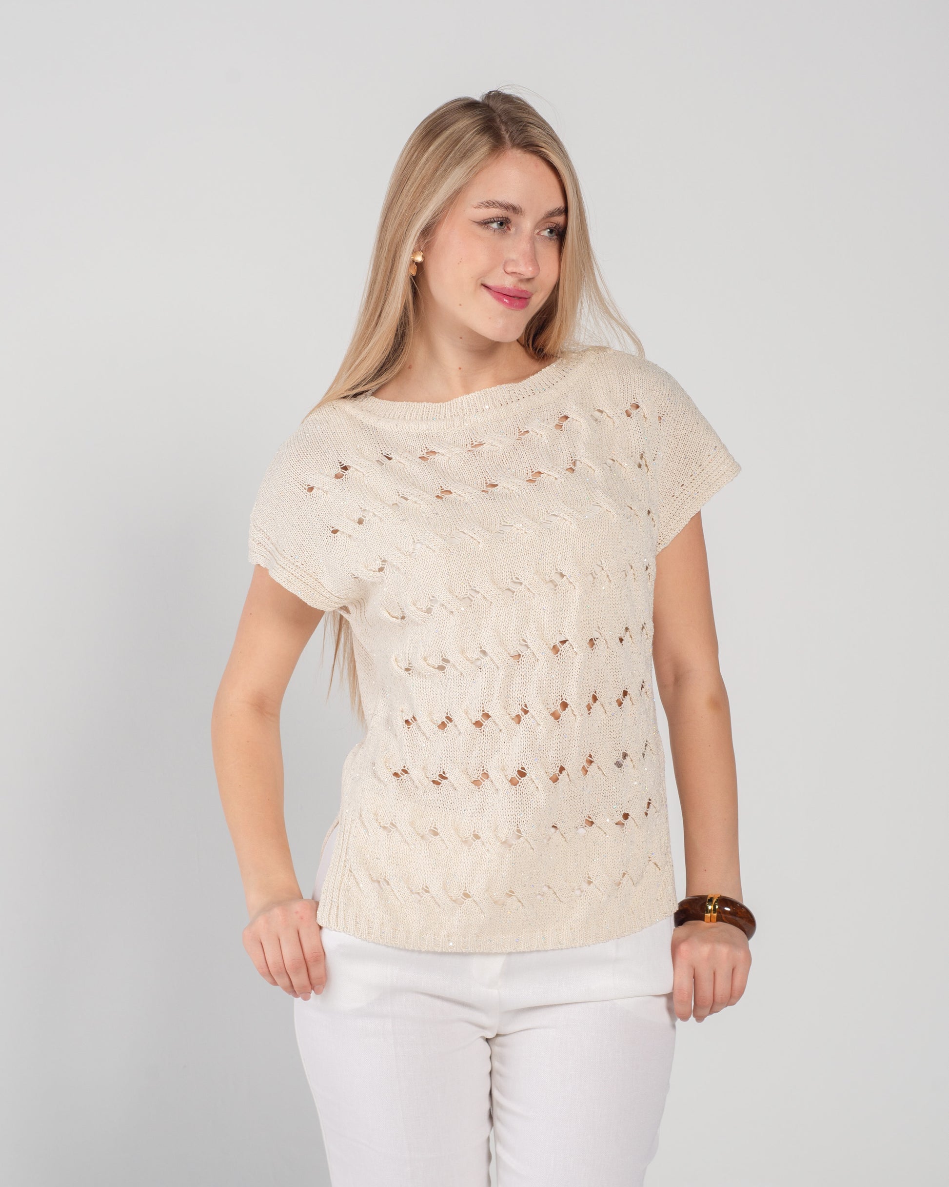 Perforated cable knit pullover, featuring a boat neck and shaved knit back. Regular fit.