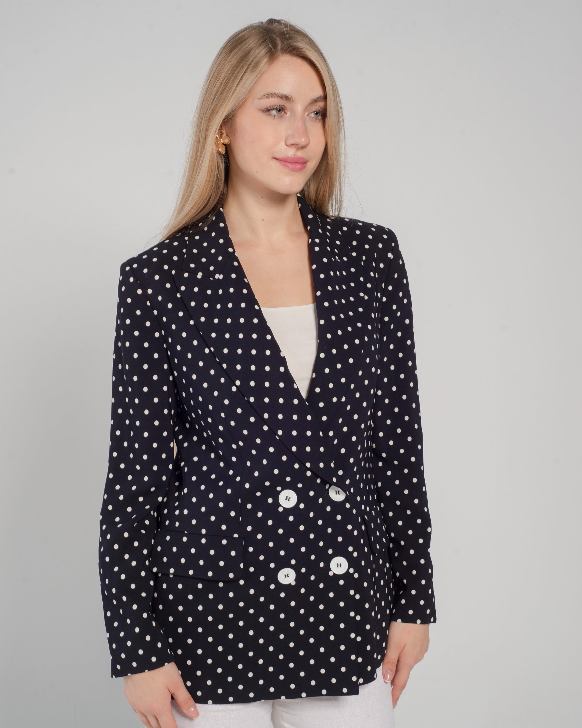 Elegant double-breasted jacket made of polka dot print viscose, featuring peak lapels and a vent in back. Regular fit.