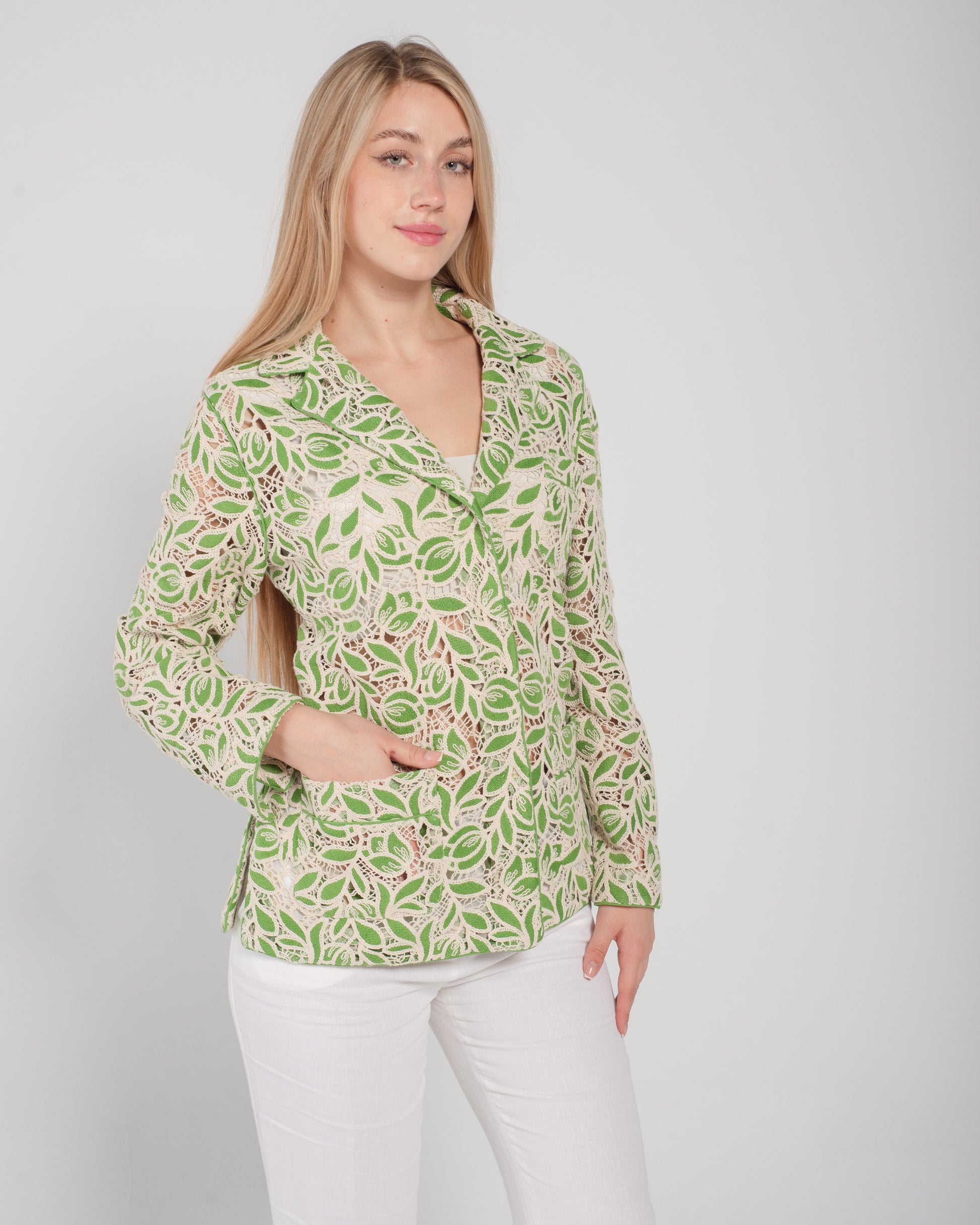 Blazer jacket made of macrame lace. Features rounded lapels, a small pocket on the chest and slitted cuffs. Regular fit.